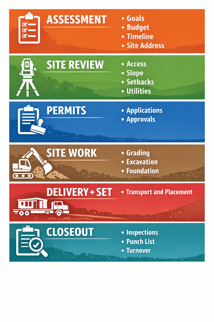 - Site Review: access, slope, setbacks, utilities